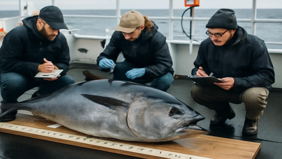 A rare giant bluefin tuna is precisely measured and officially confirmed by marine biologists using peer-reviewed scientific protocols